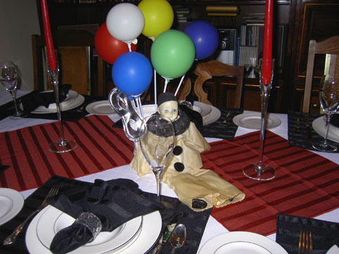 The centre piece is a combination of balloons, a mask and an antique china clown doll. The black and red setting was meant to symbolize the infamous 'harlequin'. |
