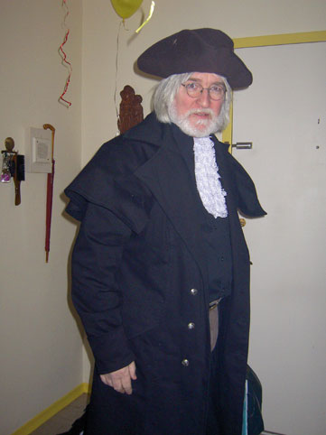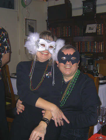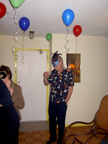 Jim dressed for the occasion in a rather colourful shirt. The balloons you see on the ceiling were scattered throughout the living/dining rooms. As the evening wore on, when they lost some of the helium, they flirted with the candles (often with predictable results), the people and drifted throughout the apartment. |