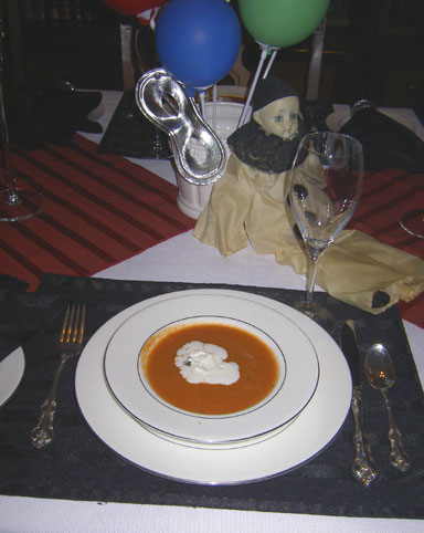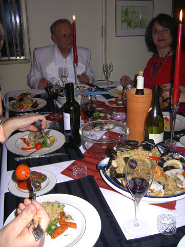 Hor d'oeuvres Bacon Wrapped Egg and Liver Pate Crab and Shrimp dip with assorted Crackers (courtesy of Genevieve) Salsa dip with assorted Crackers (courtesy of Genevieve) Appetizer Roasted Tomato Soup with Basil Mousse Main Course Paella de Marisco (Seafood Spanish Rice) Marinated Tomatoes, Cucumbers and Onions (courtesy of Cynthia) Vegetable Melange Dessert Bananas Foster II (Bananas and Walnuts in a warm Caramel and Rum sauce served over ice cream - truly decadent) |